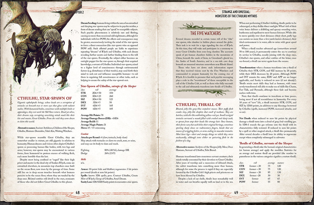 Vom Gezücht des Abhoth bis zu den Yuggs, ergänzt um weltliche Schrecken und wilde Tiere, wurden in über 150 Einträgen Informationen und Spielwerte für den Spielleiter zusammengetragen. Hier soll man die Schrecken aus der Leere, die Albtraumgeschöpfe und die unaussprechlichen Lauerer im Dunklen kennenlernen.