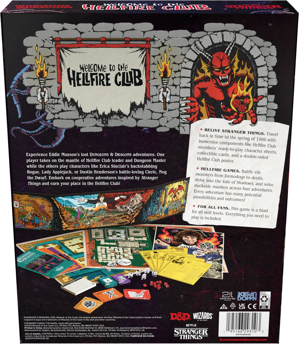 „Welcome to the Hellfire Club“ spricht sowohl eingefleischte Stranger Things-Fans als auch D&D-Neulinge an. Mit sofort spielbaren Abenteuern, kultigen Charakteren und hochwertigem Zubehör bietet das Set den perfekten Einstieg ins Rollenspiel – ganz ohne Vorwissen. Fans der Serie werden die detailgetreue Umsetzung und das 80er-Feeling lieben, während Sammler das exklusive Design und die nostalgischen Extras zu schätzen wissen. Ideal für Spielabende, als Geschenk für DND oder Stranger Things Fans oder als Highlight jeder Fan-Kollektion.