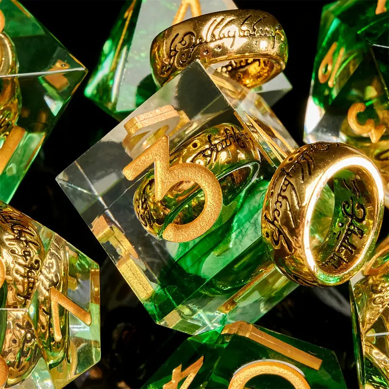 Dieses edle Würfelset beinhaltet ein Geheimnis - Den einen Ring. Mit seinen goldenen Akzenten erschafft dieses Würfelset ein einzigartiges Spielerlebnis.