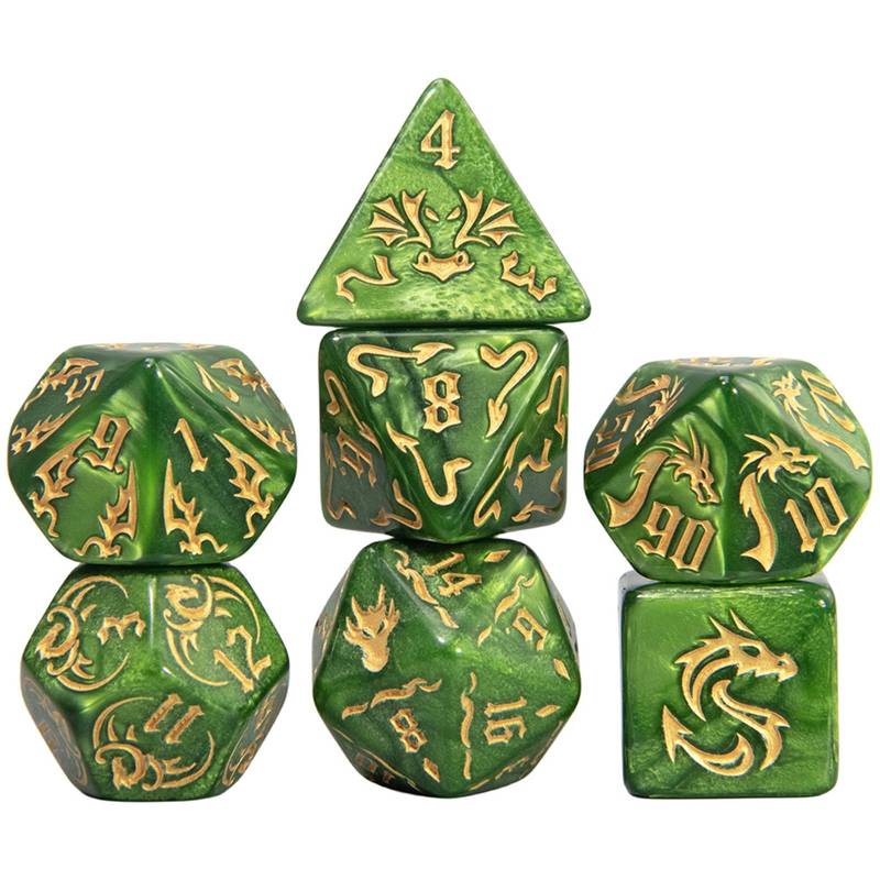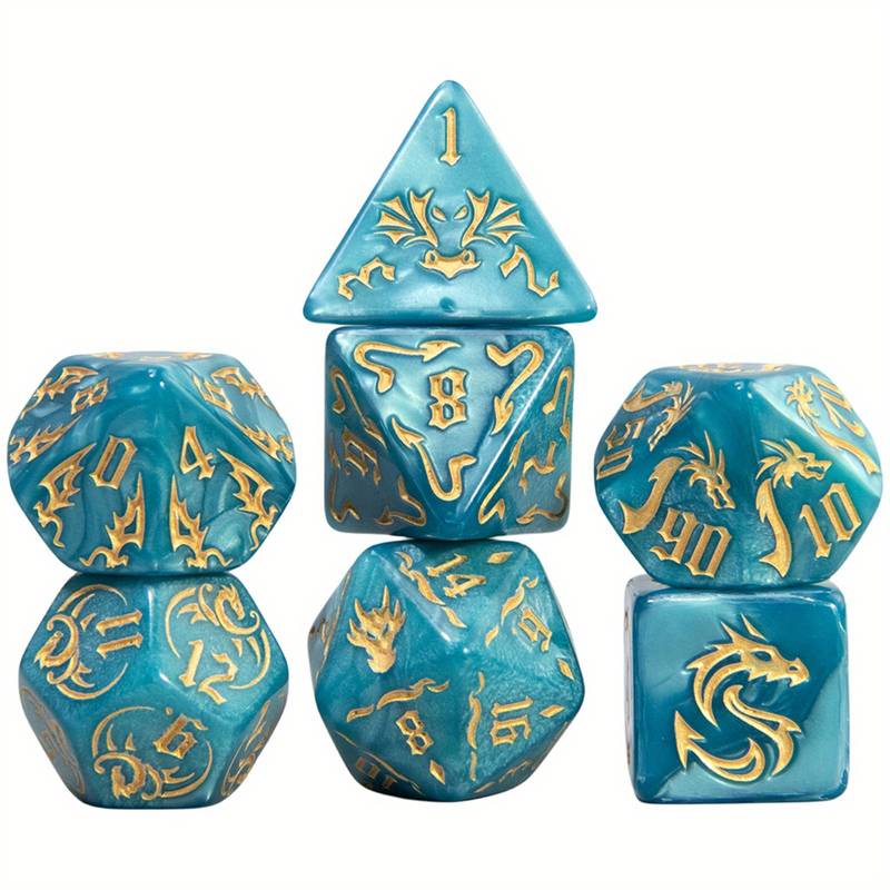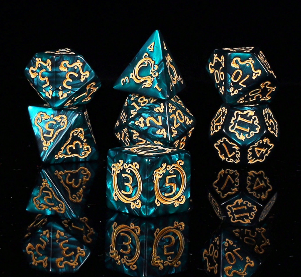 Mit diesen Würfeln hältst du die Magie der Drachen in deinen Händen. Erhältlich in Waldgrün, Schwarz oder Türkis und verziert mit goldenen Akzenten – ein echtes Highlight für deine Sammlung!