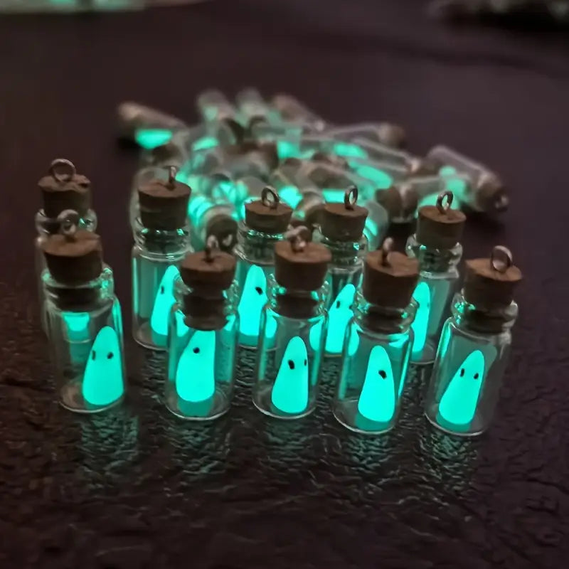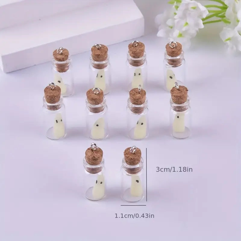 10 kleine Geister, welche im Dunkeln leuchten. Mit Korken und Aufhängung für Ohrringe oder Ketten.