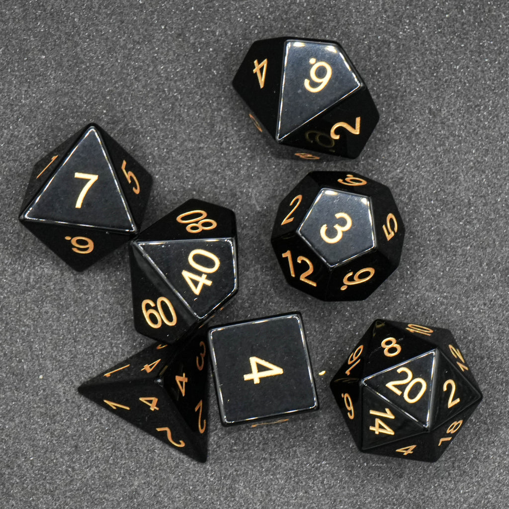 Obsidian gilt als mythischer Stein aus den Untiefen der Erde, auch bekannt als Drachenglas. Diese Würfel spiegeln in ihrem edlen Design und dem hochwertigen Schliff wider, was die Träger dieses Sets verkörpern: Kraft, Eleganz und ein Mysterium, das es zu lösen gilt.