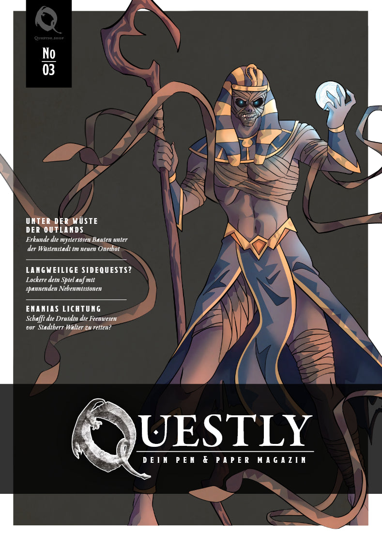 Jede Ausgabe des Questly enthält ein brandneues Abenteuer, spannende Fantasy-Kurzgeschichten aus der Welt von Quest, den Encounter of the Month mit neuen Kreaturen, Tipps & Tricks für dein eigenes D&D-Spiel, Community-Beiträge und jede Menge einzigartiger Artworks von talentierten Künstlern.